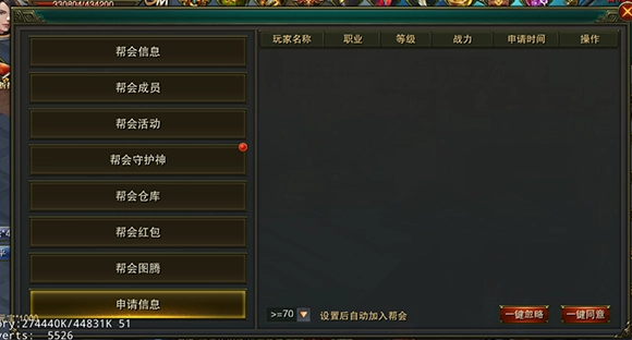 申请列表可以查看所有申请加入帮会的玩家信息,进行批准或者拒绝。