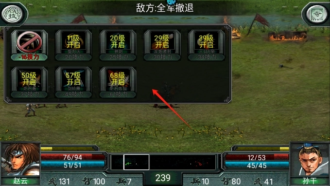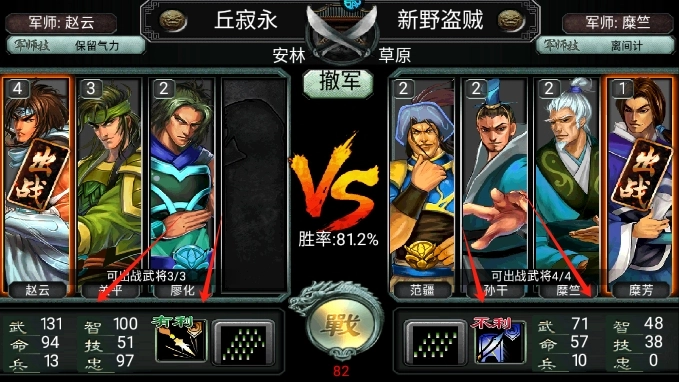 在安排武将出战顺序时需格外留意,出征前务必将生命值、技能值与士兵数量全部补满。尽量搭配不同兵种的武将,优先派遣能克制敌军的兵种上阵,而己方的高级武将则应留存至关键节点,用以对抗敌方的高级将领。