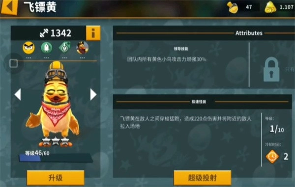 1、飞镖黄:团队内所有黄色小鸟攻击力增强30%。