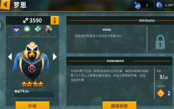 2、罗恩:团队内所有蓝色小鸟攻击力增强30%。