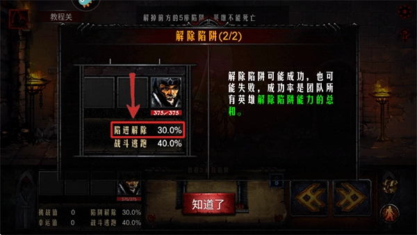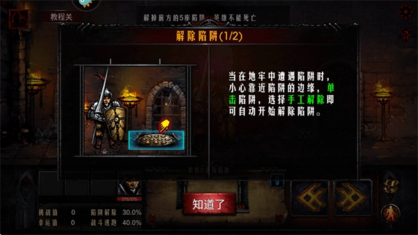 4、在地牢中遭遇陷阱时,需小心靠近陷阱边缘,单击陷阱并选择“手工解除”,即可自动启动解除流程。解除陷阱存在成功或失败的可能,其成功率取决于团队所有英雄解除陷阱能力的总和。