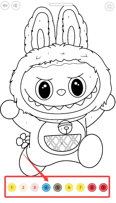 2、根据调色板上的数字对应关系,选择正确颜色填充相应区域,逐步完成角色上色。