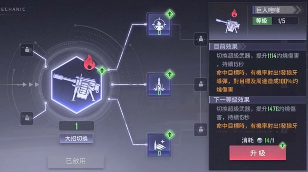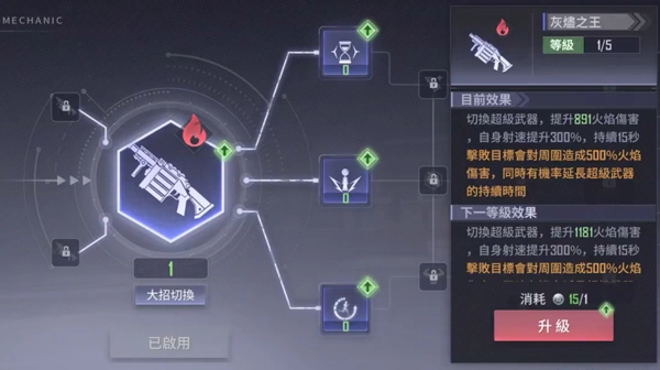 火属性。 自身攻击速度提升300%,击败目标时会对其周围造成500%的火焰伤害,且有一定概率延长超级武器的持续时间。