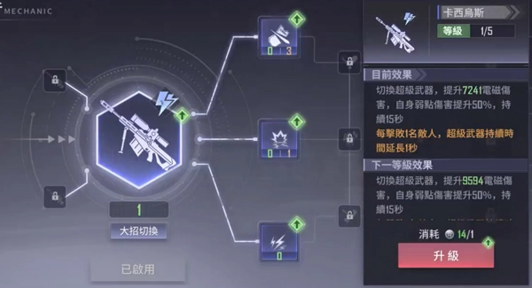 雷属性。 提升电磁伤害,弱点伤害提升50%,每击败1名敌人超级武器持续时间延长1秒。