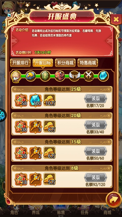 1、进入游戏后可以先领取开服签到奖励。
