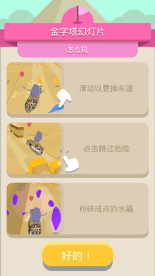 滑动以更改车道,点击跳过危险,粉碎成点的水晶。