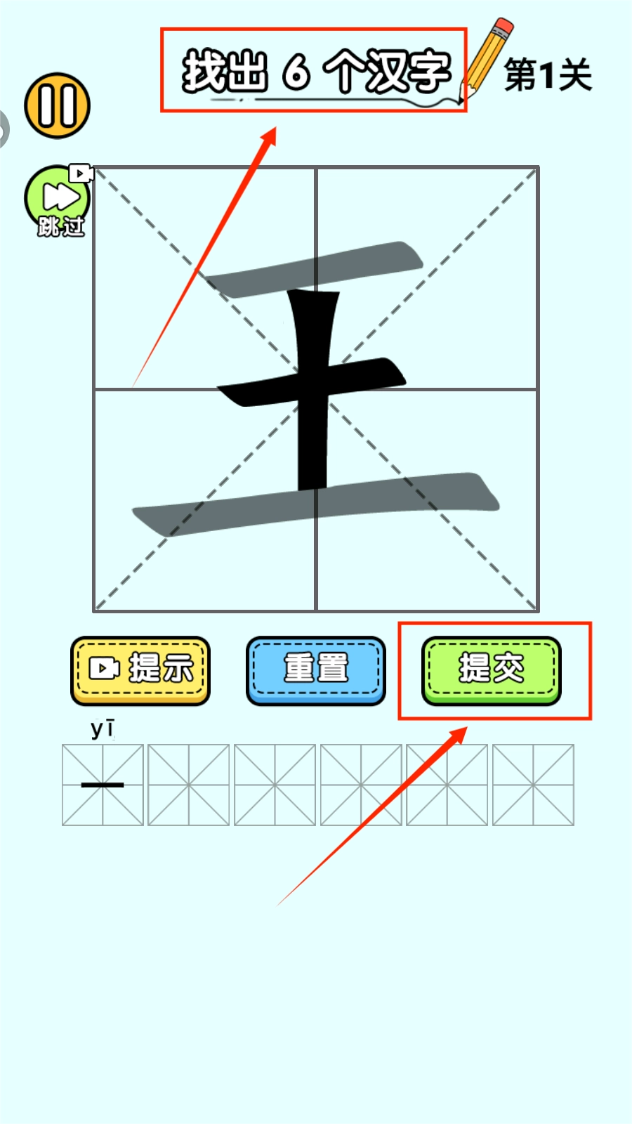3、根据提示找出6个汉字,每找出一个可以选择提交。