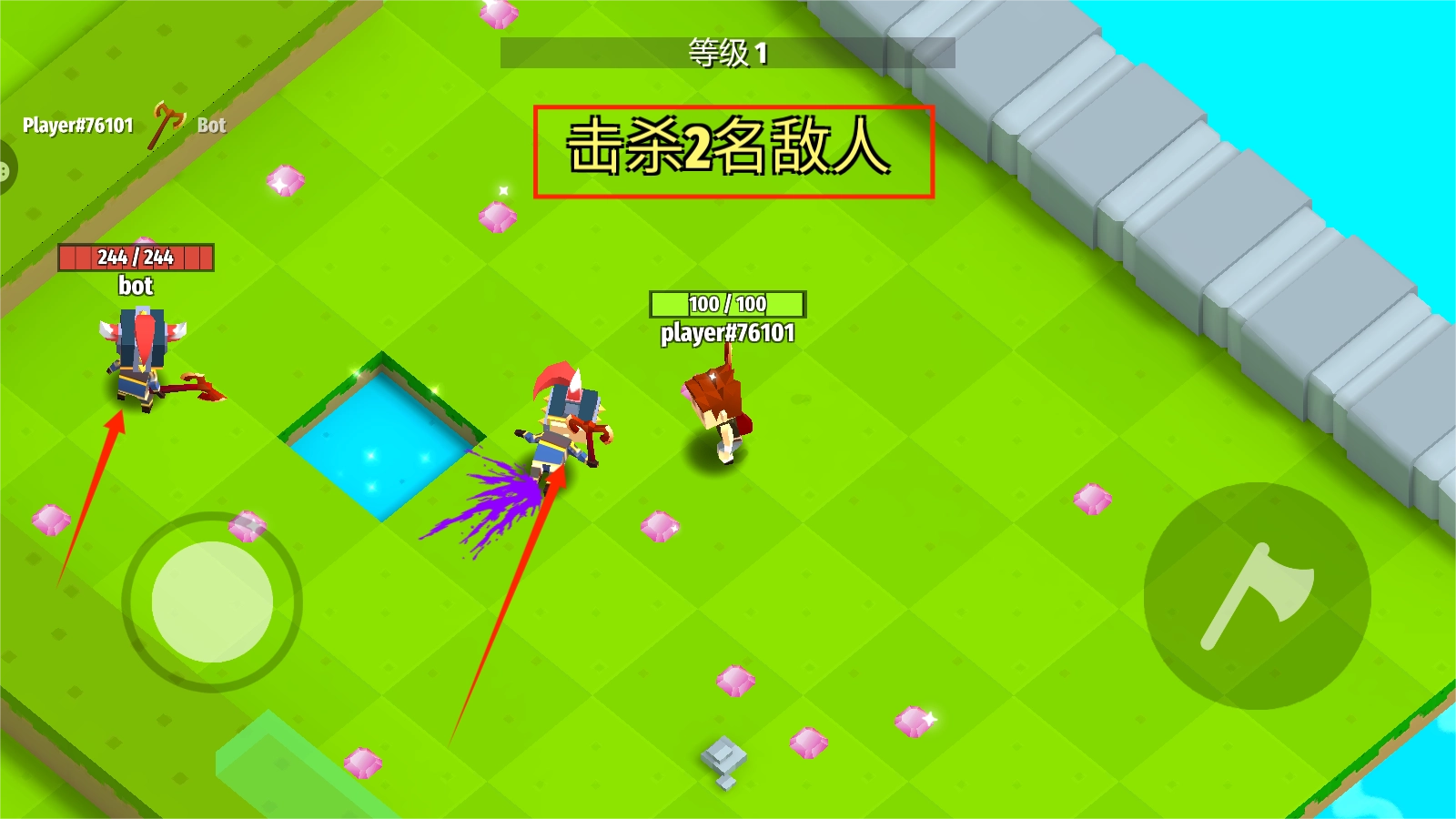 1、核心玩法为俯视角竞技场对战,玩家通过虚拟摇杆操控角色移动,点击按钮即可投掷武器。击败对手可积累积分,最终存活至最后的玩家将获得胜利。