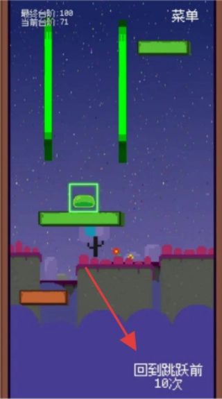 1、跳跃操控:操控绿色方块角色进行跳跃,以此越过地形上的障碍。