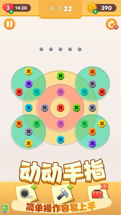 2、关卡设计巧思十足,从基础的螺丝排布到繁复的多层构造,每一个新关卡都会推出别具一格的机关设施,像传送带、压力板之类,使得消除环节富有策略性。