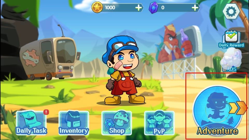 1、在主界面点击Adventure按钮,即可让戴蓝帽角色开启冒险之旅,踏入绿意盎然的关卡场景,准备探索挑战。