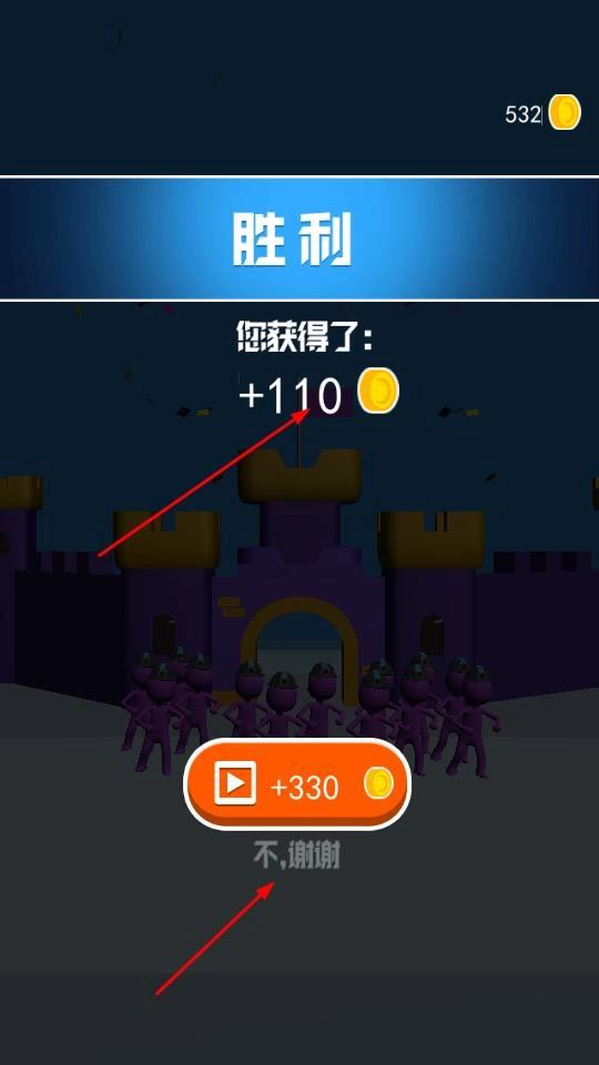 3、成功抵达城堡终点后,获取金币奖励,可选择观看广告翻倍收益或直接领取,解锁后续关卡挑战。