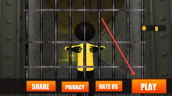 1、点击界面右侧橙色的PLAY按钮,即可进入游戏流程,操控火柴人开启以越狱为主题的冒险旅程。
