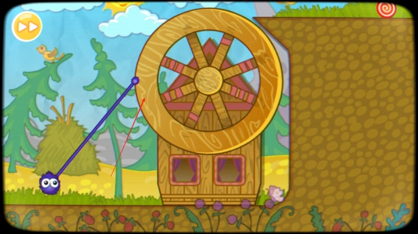 1、操控毛蛋靠近水车,点击屏幕让,毛蛋伸出紫色手臂粘在水车上,利用水车转动,让毛蛋朝着糖的方向移动。