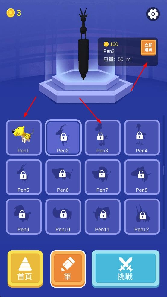 3、进入笔的界面后,消耗金币解锁Pen2这类新笔,以此提升道具能力,为后续挑战提供助力。