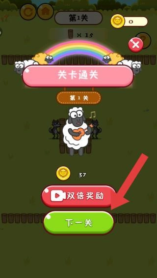 3、显示第1关的关卡通关,奖励金币+37,可点击双倍领取也可直接点击下一关继续进行游玩。