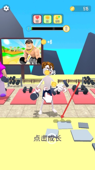 2、前往健身区,点击角色身上闪烁部位如手臂、腿部进行成长,同时来收集场景中的漂浮的金币。