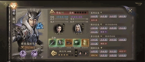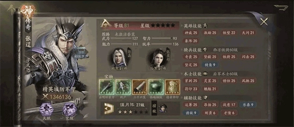 张辽需要高四维,他的闪击需要武力和魅力都高才能打出最高伤害,同时统帅也要超过对方,让昂扬的高级效果得到释放,智力配合智计同样不可或缺