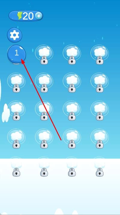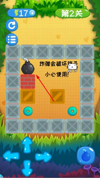 1、进入游戏,在关卡选择界面,选择第1关,通过虚拟方向按钮控制猫咪移动方向,利用炸弹破坏砖块开辟道路。