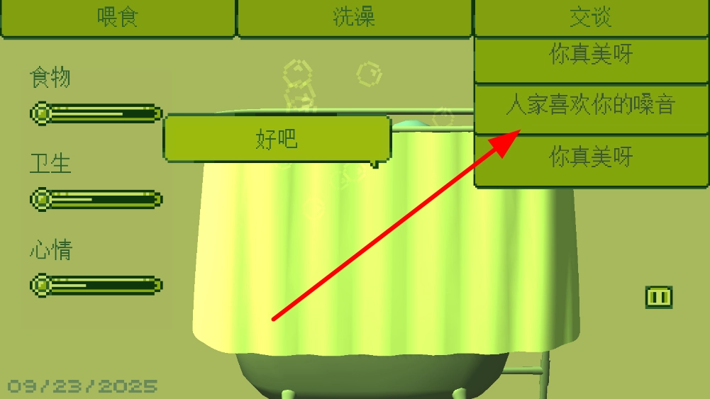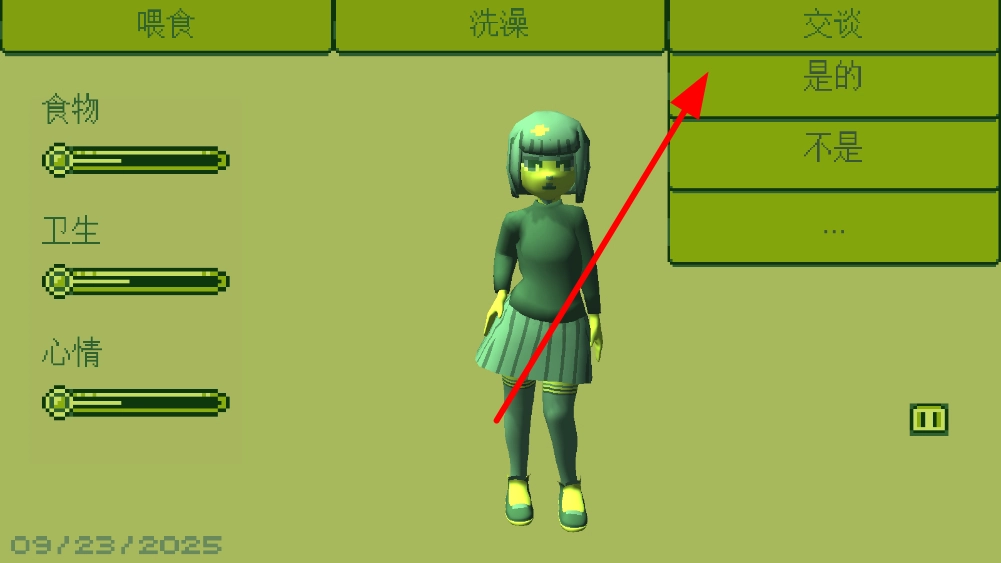 1、在交谈选项中选择合适的话语,和角色互动,通过交流能提升角色的心情等状态,让角色保持良好的情绪。