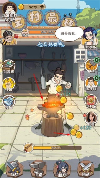 1、操控角色进行打铁操作,每次打铁可获取金币奖励,同时积累打铁的进度。