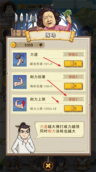 2、可花费金币升级各项属性,如力道、耐力回复、耐力上限,增强打铁的能力,让打铁更高效。