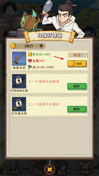 3、可花费金币升级打造物,解锁更高级的武器,提升武器的属性,为后续的比拼等环节提供更强的装备支持。