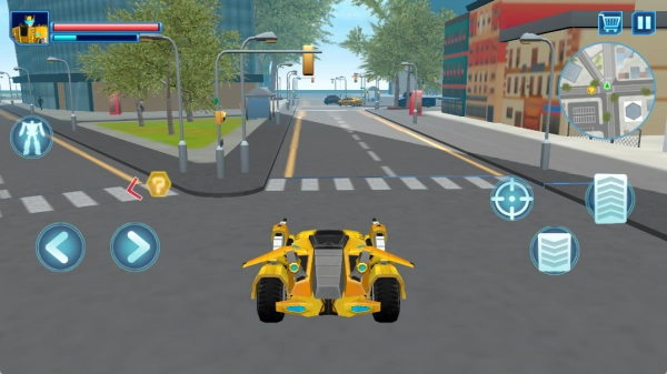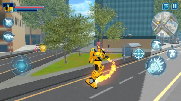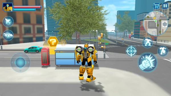 1、玩家操控机甲在城市中自由穿梭,通过虚拟摇杆控制移动方向,点击屏幕按钮触发基础攻击。