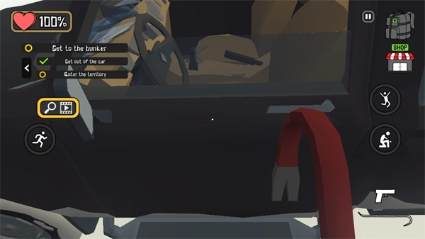1、进入24号地堡的游戏结束剧情,撞车发生后,视角会朝右移动,之后点击“Take”按钮,拾取背包与撬棍。