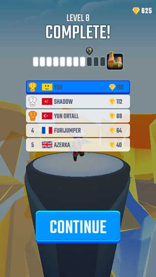 4、当我们抵达终点后会生成一个排行统计,位列第一名的玩家将获得较为丰厚的金币奖励,这些金币可用于解锁各类皮肤