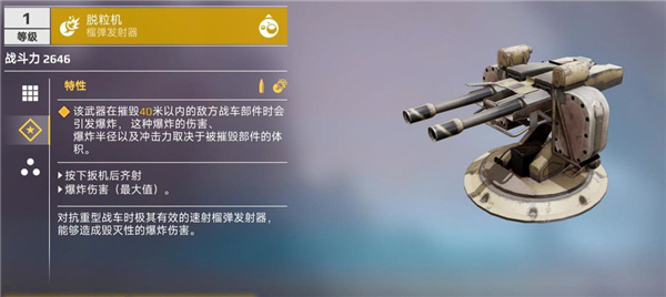 “脱粒机”的独特之处在于其弹道,它更接近加农炮和非制导火箭的飞行轨迹。这款榴弹发射器的使用方式鼓励玩家进行中近距离的战斗,其技能设置也充分体现了这一点:它能够引爆40米内被摧毁的部件。这意味着“脱粒机”能够以惊人的速度快速摧毁大量结构部件,成为战场上的一大利器。