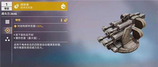 就使用方式而言,“喷射者”堪称“GL-55冲击者”的升级版,每次射击都以极高的射角发射4枚榴弹。其技能效果直观明了:对结构部件造成的伤害提升30%,这意味着“喷射者”能够造成与其外观极不相称的恐怖伤害。