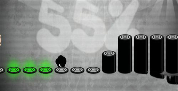 暗色系的画面在眼前铺展开来,像宫崎骏里萌货的“小煤球”摇身一变成为主角,此刻的它披着墨水制作的外衣整装待发,延绵不断的树桩道路,绿色的欣慰,红色的未知,冒险之路即将启程。当按下开始键时,富有节奏感的动次打次就此展开,小墨球伴随着滑稽音乐的舞步,每每跳跃一步就会响起一声声嚓嚓“锣”声,边起跳边发出萌呆的叫声,跳跃与背景音乐完美地融合了在一起。