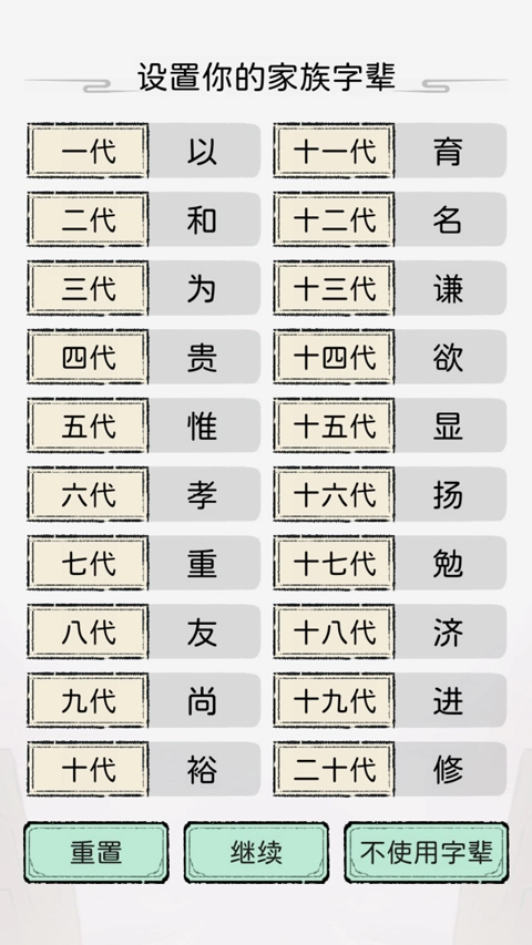2、接着选择家族的字辈系统,从二十代字辈中任选一个作为家族传承;