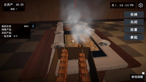 4. 收货及摆放步骤:物资送达后,先点击拿取并拆开包装,接着靠近餐桌,将关东煮摆放整齐。