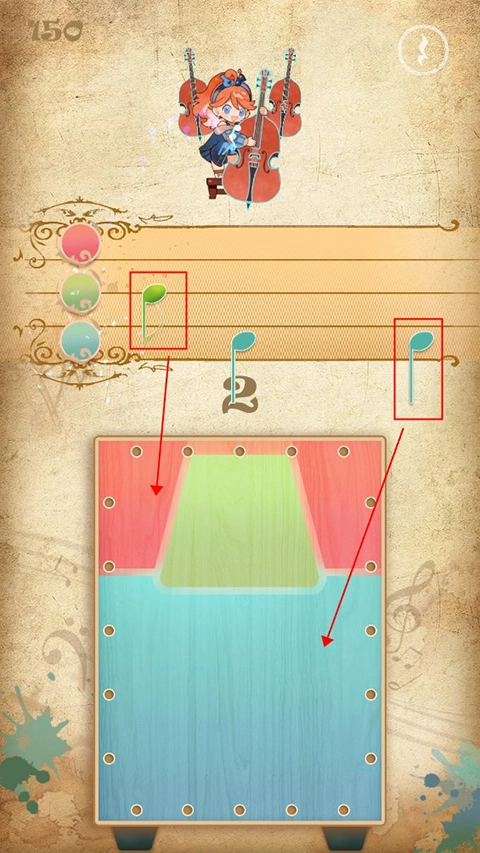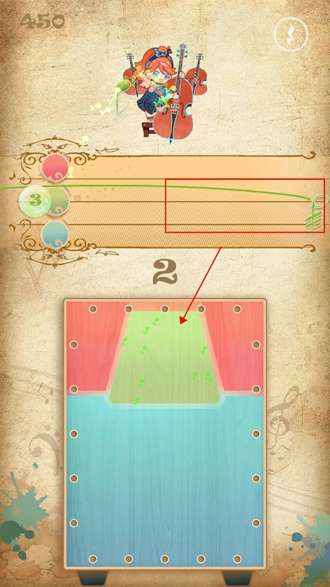 4、游戏的主要玩法为三色演奏,届时屏幕上方会出现音符,玩家需点击下方与之对应的颜色来收集音符,同时也能够依据鼓声节奏进行击鼓操作。
