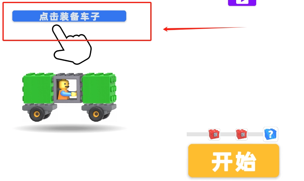 1、通过界面可以为你的积木车进行装备操作,点击上方的蓝色文字来装备车子,接着点击右下角的黄色“开始”按钮就能进入游戏环节。