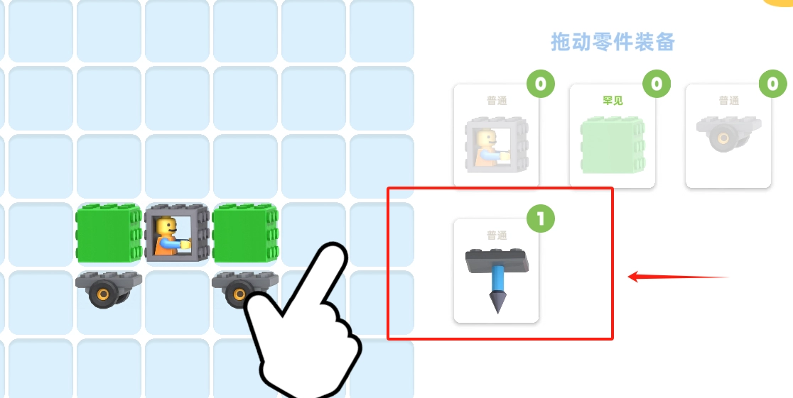 2、选零件装车时,在想要的零件左侧勾选(比如普通刷子),按住红框区域拖到车上即可;若要更换零件,可查看右侧的计数器。