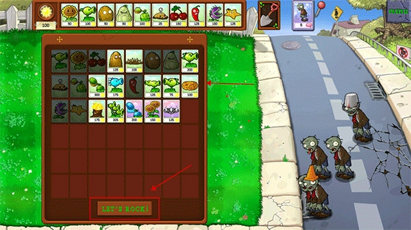 1、游戏开局时,玩家需先挑选要上场的植物,选好植物后点击“lets rock”即可开启游戏。