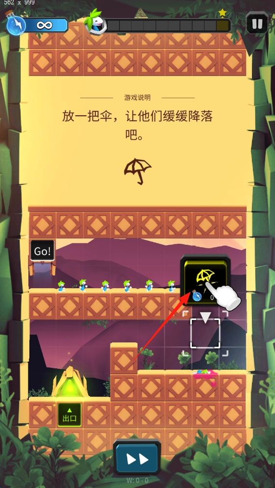 3、按说明,放置伞道具,使角色安全降落,通过障碍,到达终点。