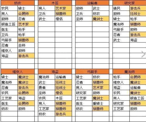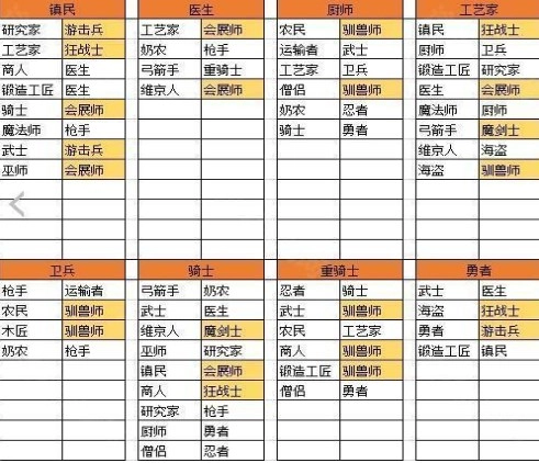 镇民、医生、厨师、工艺家、卫兵、骑士、重骑士、勇者父母职业搭配如下