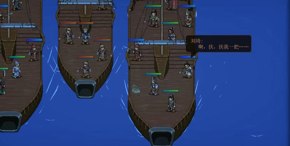 1、叙事沉浸:刘琦受伤情境、水战背景(舰船、海浪)、救援互动,通过“危机场景→角色对话→操作反馈”的链路,强化三国水战的叙事代入感。