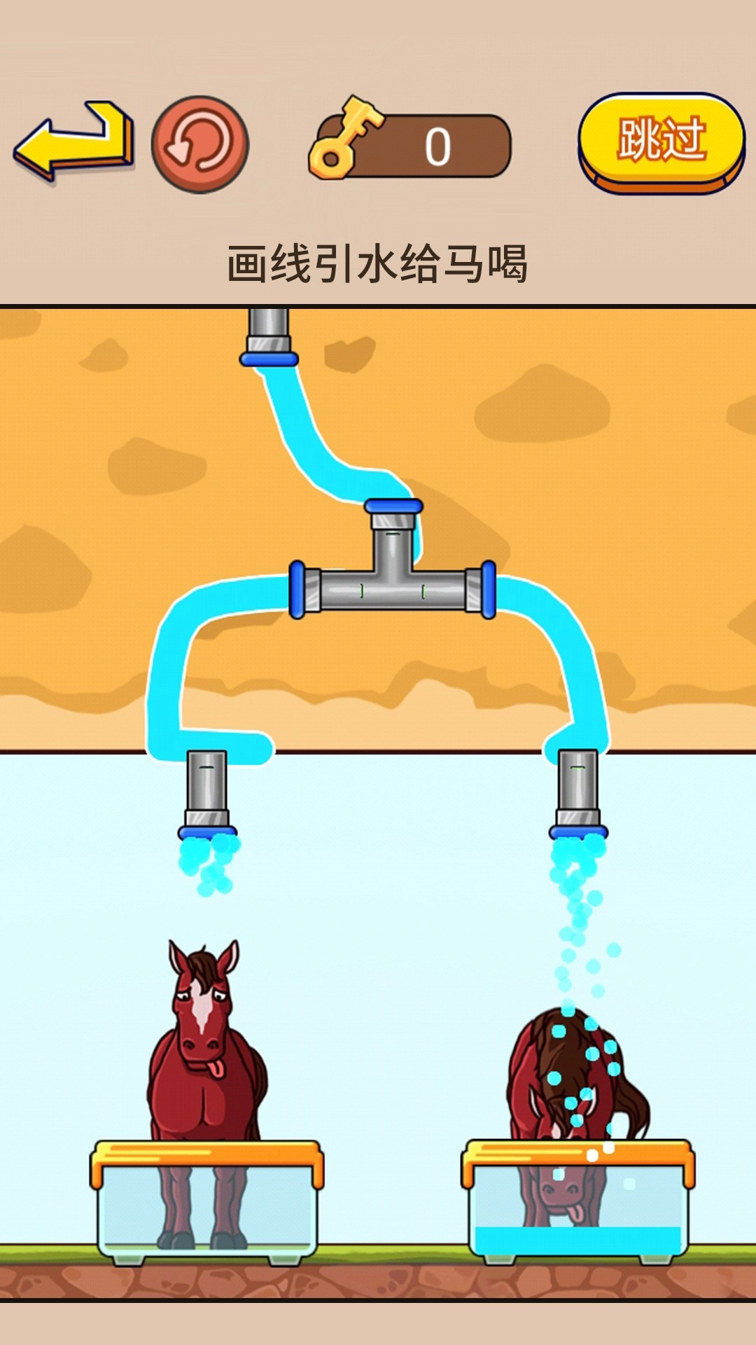 4、合理路径:玩家得画出合适的连线,把水管和进水口连接起来,让马匹能喝到水。