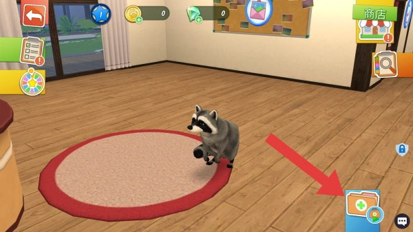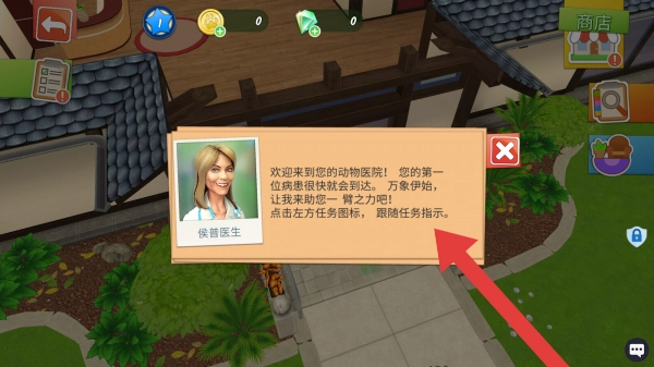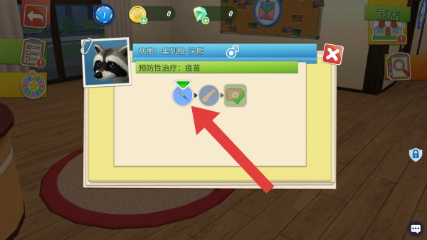 3、左上角的返回箭头、蓝球金币绿钻等资源显示以及商店入口等元素,构成了宠物诊疗流程里的操作指引部分,其中红色箭头明确指向与疫苗接种操作步骤相关的图标。
