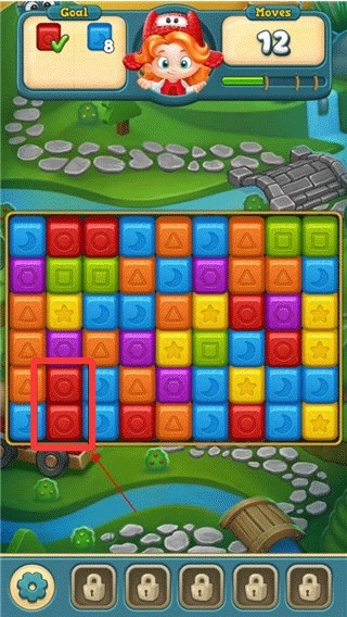 进入关卡后,画面里会出现多种颜色的玩具方块,点击两个及以上相同的方块就能将其消除,完成目标后即可解锁后续地图。