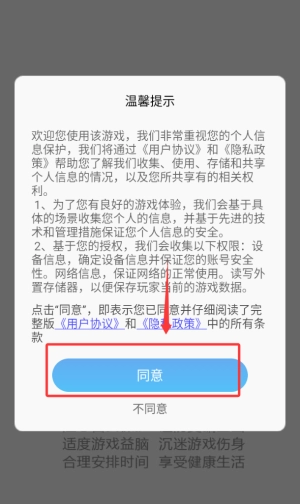 1、首次启动需阅读并确认用户协议,点击底部同意按钮即可进入游戏主界面。