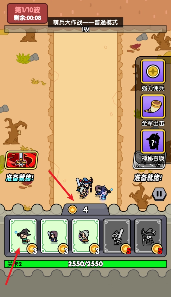 1、进入游戏后,可以看到下方自己的士兵,点击即可消耗金币召唤,金币会自动的增长。