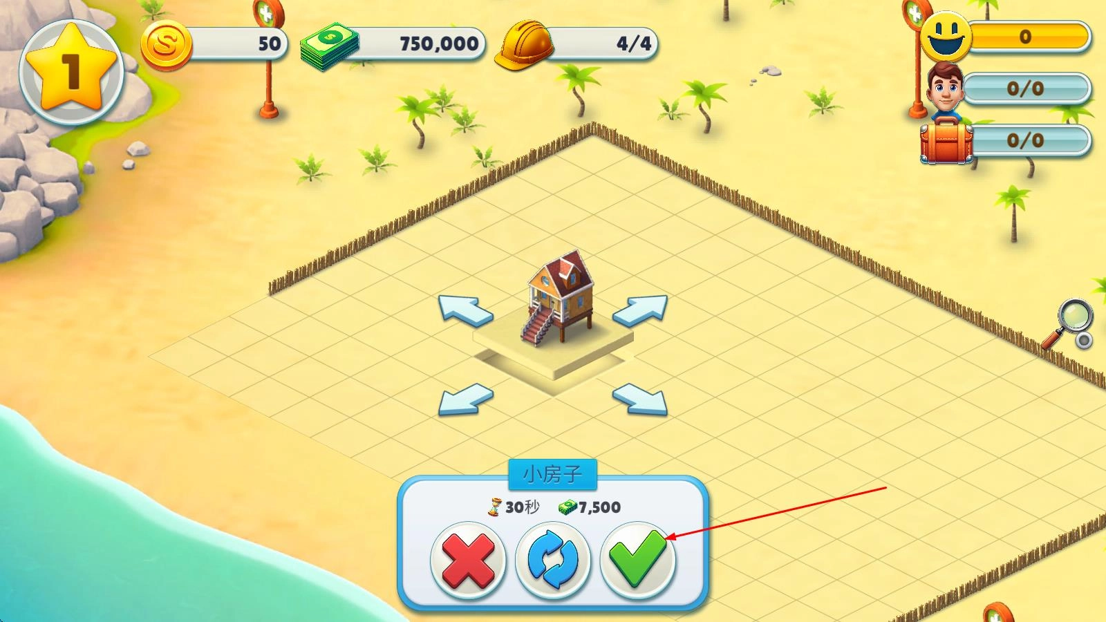 1、启动游戏后,可选择跟随新手指引逐步操作,也能直接跳过教程;接着点击界面左下角的购物篮图标,优先建造住宅类建筑以吸引居民入驻,选定合适的建造位置后点击绿色对勾按钮确认,完成第一栋建筑的剪彩仪式,即可正式开启你的镇长职业生涯。