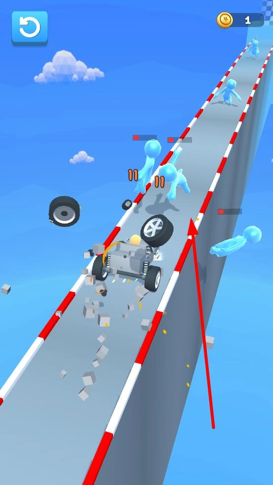 2、在赛道上,操控汽车左右移动、跳跃,躲避蓝色敌人、掉落轮胎等障碍,保持车辆的整体完整,并且冲向终点。