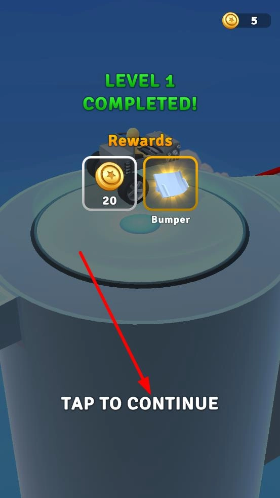 3、完成关卡后,界面会出现“LEVEL 1 COMPLETED!”的提示,点击“TAP TO CONTINUE”按钮,即可获取金币、Bumper等奖励,这些奖励可用于升级车辆的各类部件。
